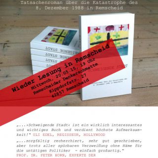 Vor eineinhalb Jahren hatte ich in diesem Blog Veronika Wolfs Buch „Schweigende Stadt“ vorgestellt. Es beschreibt den Absturz eines amerikanischen Kampfbombers auf ein Wohnviertel mitten in Remscheid vor 25 Jahren und die Folgen, und zwar aus der Sicht einer direkt betroffenen, sehr engagierten und mutigen Frau. Jetzt ist Veronika Wolf auf Lesereise, die nächste Lesung ist am 20.05.15 in der Remscheider Denkerschmette.